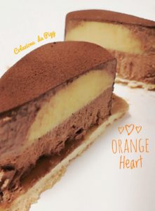 Versare la mousse nello stampo a cuore fino a metà, mettere la semi sfera di cremoso all’arancia e coprire con altra mousse e congelare.